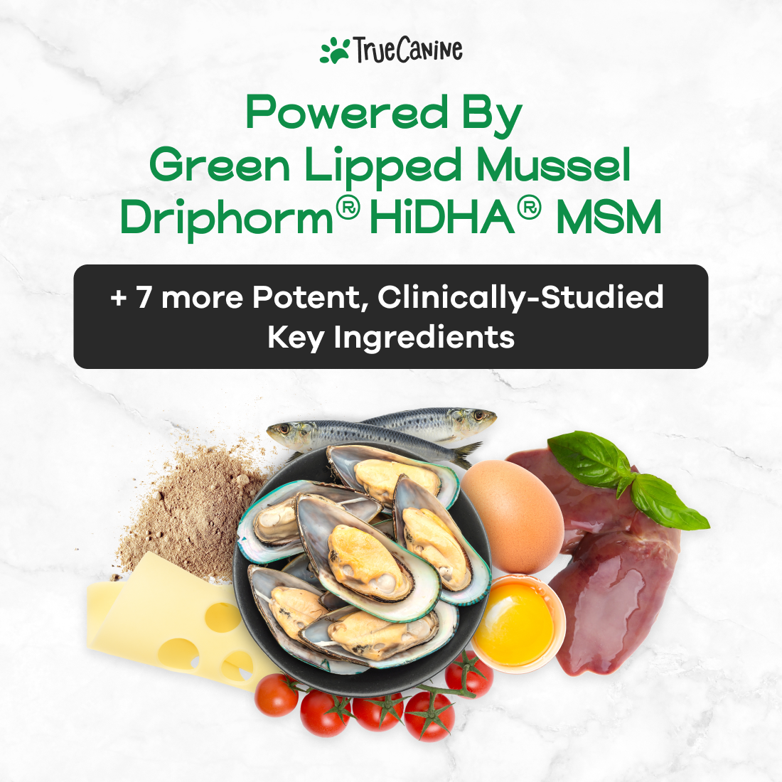 Shown in trials to support cartilage and joint health in aging dogs. These “Green Treasures” from the sea are also rich in proteins, omega-3s, and antioxidants.